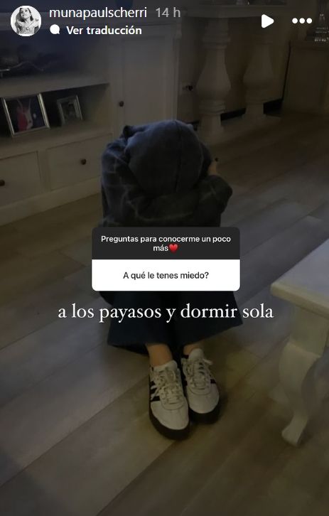 Una de las primeras dudas que la adolescente develó fue sobre sus miedos más profundos. Muna eligió una foto donde se la ve acurrucada en el piso, cubriéndose la cabeza con los brazos para indicar que le tiene mucho miedo “a los payasos y a dormir sola”.
