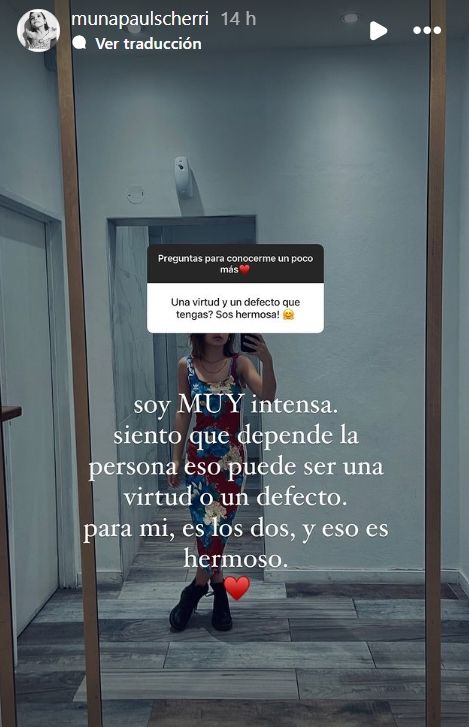 A continuación, Muna se animó a mencionar una virtud y un defecto propios: “Soy muy intensa, siento que depende la persona eso puede ser una virtud o un defecto, Para mí es los dos y eso es hermoso”.