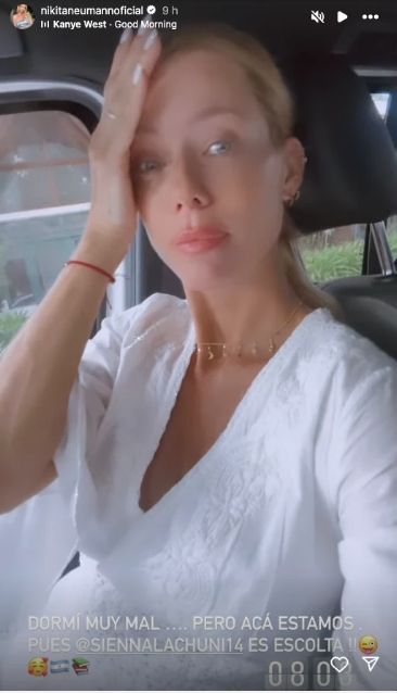 Con una foto dentro de su auto, en la que se percibía una gestualidad de una noche complicada en cuanto a la conciliación del sueño, Nicole le contó a sus followers la novedad: "Dormí muy mal pero acá estamos pues Sienna es escolta de la bandera".