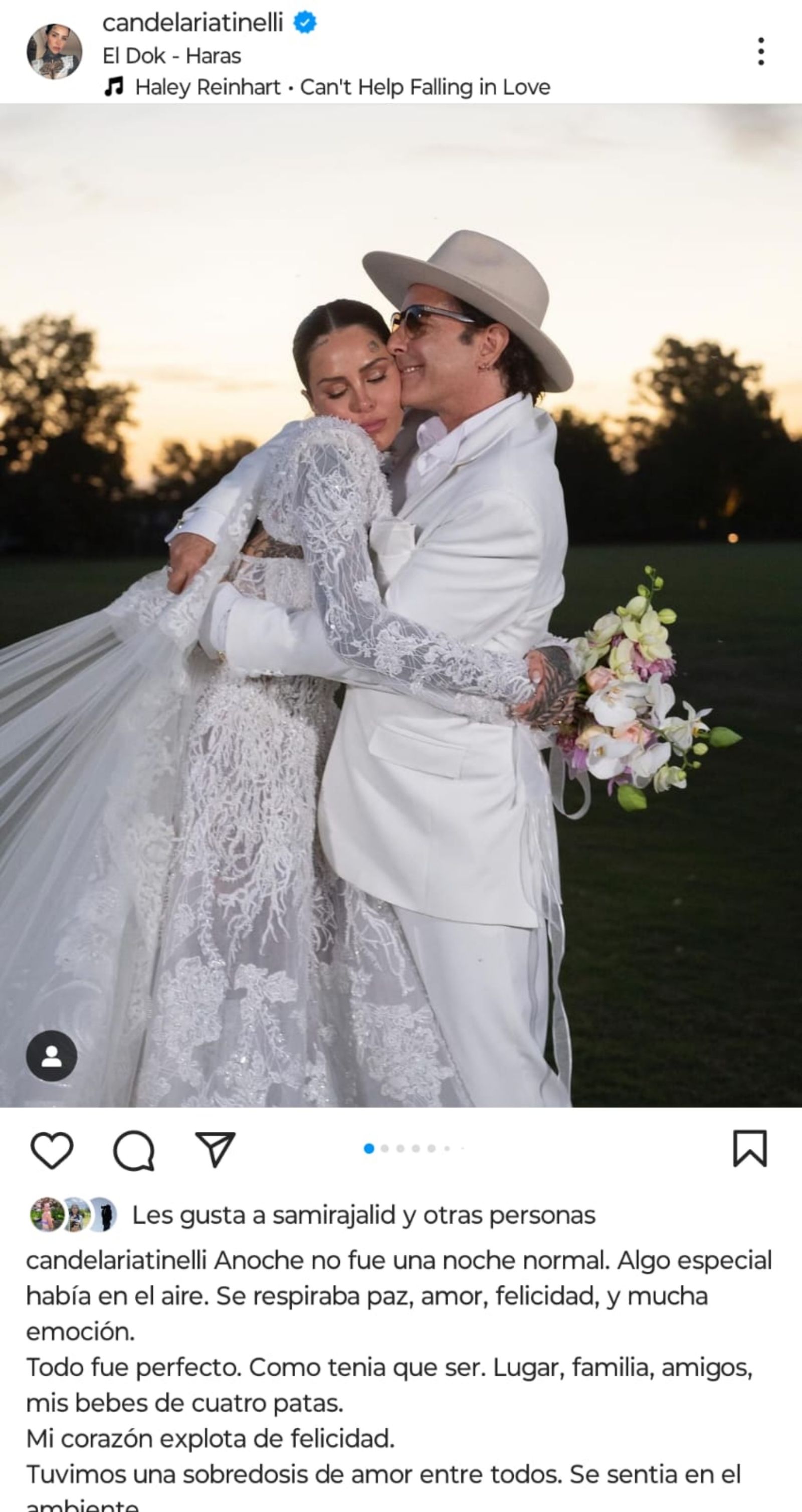 "Anoche no fue una noche normal. Algo especial había en el aire. Se respiraba paz, amor, felicidad, y mucha emoción. Todo fue perfecto. Como tenia que ser. Lugar, familia, amigos, mis bebes de cuatro patas. Mi corazón explota de felicidad. Tuvimos una sobredosis de amor entre todos. Se sentía en el ambiente. Solo tengo palabras de agradecimiento a todos y todas. Mucha gente trabajo duro para que esto sea así de increíble. Ni de mas, ni de menos. Todo era justo. Hermoso. Me llevo a mi almohada una profunda sensación de paz y alegría. En un universo ideal, desearía que todos los días de mi vida sean como anoche. Amo a mi familia con locura. Hoy me costo separarme después de unos días mágicos.", dice la primera parte del posteo.
