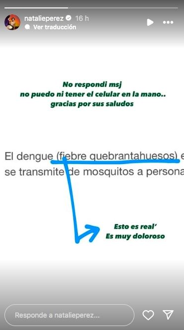 Natalie Pérez sorprendió a sus millones de seguidores en las redes sociales al revelar que padece dengue. En su mensaje reveló que la está pasando muy mal con esta enfermedad que la afecta.