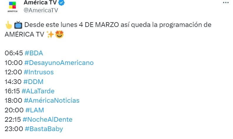El canal América comunicó en Twitter la tabla completa de programas y horarios que podrá verse en el arranque fuerte de 2024. La mañana empieza bien temprano, a las 6:45, con Buenos Días América, el ciclo históricamente conducido por Antonio Laje que ahora quedó en manos de Fabián Doman.