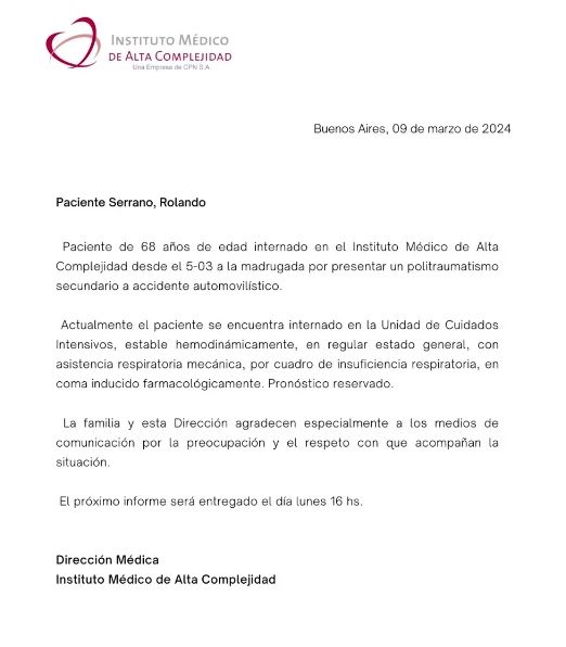 Luego del accidente automovilístico que protagonizó Roly Serrano el pasado domingo 3 de marzo, hace unas horas el Instituto Médico de Alta Complejidad difundió un nuevo parte médico sobre el estado de salud del actor de 68 años.