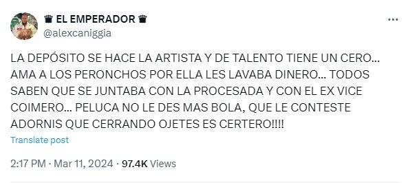 "La Depósito se hace la artista y de talento tiene un cero... Ama a los peronchos porque ella les lava el dinero. Todos saben que se juntaba con la procesada y con el ex vice coimero", escribió picante el mediático.