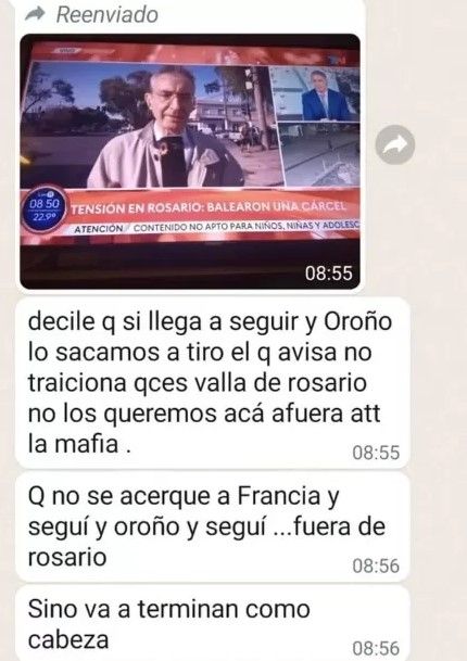 Nelson Castro y su equipo tuvieron que hacer una parada y en plena transmisión con el estudio de TN, el periodista contó que estaban “impactados”, porque es “claramente una demostración de lo que está sucediendo en Rosario”. Los mensajes llegaron a las 9 de la mañana con un reenviado de la foto del periodista transmitiendo en vivo. “Decirle que si llega a Seguí y Oroño lo sacamos a tiros. El que avisa no traiciona, que se vaya de Rosario, no lo queremos acá, afuera, atentamente La Mafia. Que no se acerque a Francia y Seguí y Oroño. Fuera de Rosario. Si no van a terminar como Cabezas”.