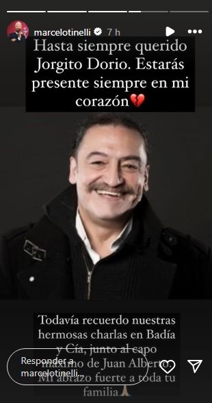"Hasta siempre querido Jorgito Dorio. Estarás presente siempre en mi corazón", compartió Marcelo Tinelli. Luego agregó: "Todavía recuerdo nuestras hermosas charlas en Badía y Cía, junto al capo máximo de Juan Alberto. Mi abrazo fuerte a toda tu familia".