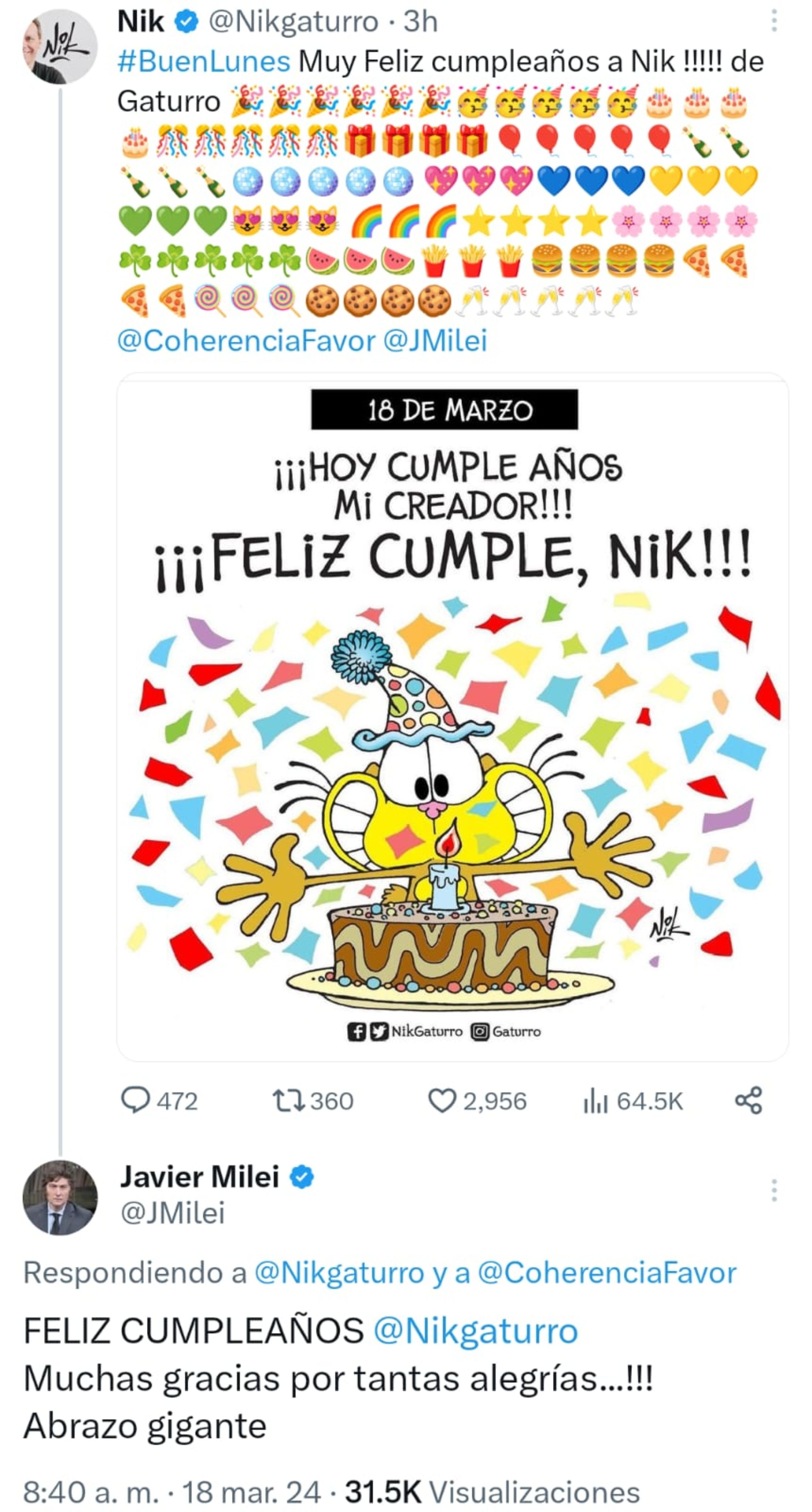 "FELIZ CUMPLEAÑOS @Nikgaturro. ¡¡¡Muchas gracias por tantas alegrías...!!! Abrazo gigante", fue el saludo que le envió Milei a Nik a través de la red social X (anteriormente Twitter). Minutos después, el artista le agradeció a la figura de La Libertad Avanza: "Muchas gracias, Sr. Presidente @JMilei".