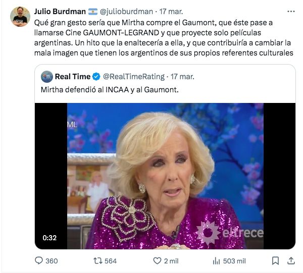 "Qué gran gesto sería que Mirtha compre el Gaumont, que éste pase a llamarse Cine GAUMONT-LEGRAND y que proyecte solo películas argentinas. Un hito que la enaltecería a ella, y que contribuiría a cambiar la mala imagen que tienen los argentinos de sus propios referentes culturales", expuso Burdman.