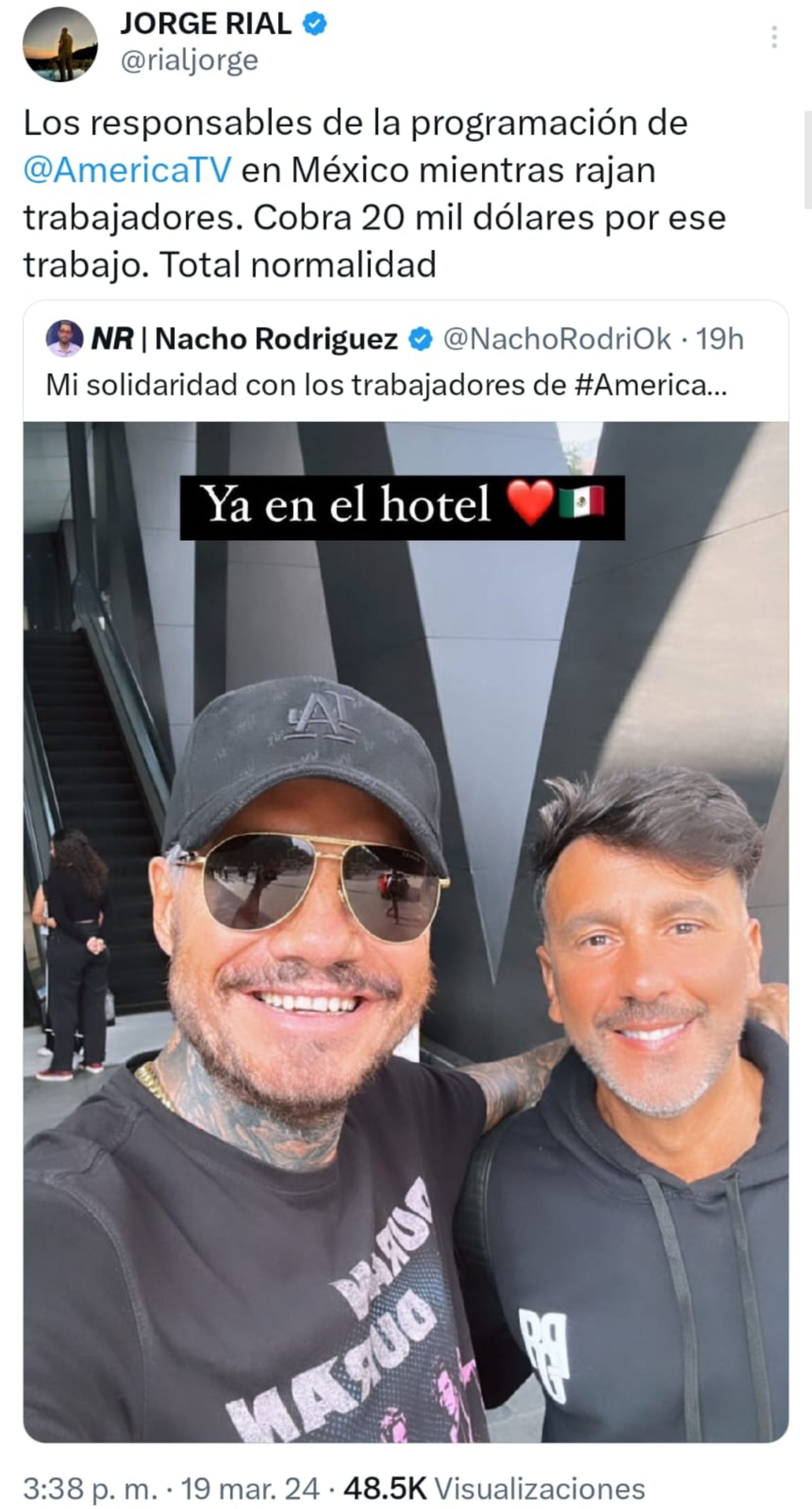 El silencio de Tinelli ha enfurecido a Jorge Rial, quien este martes se pronunció en la red social X (anteriormente Twitter) en contra del empresario. Rial compartió la foto que subió Marcelo en sus redes sociales y dijo: "Los responsables de la programación de @AmericaTV en México mientras rajan trabajadores. Cobra 20 mil dólares por ese trabajo. Total normalidad".