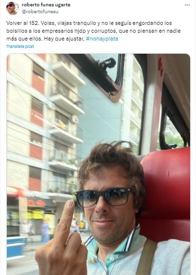 "Volver al 152. Volas, viajas tranquilo y no le seguís engordando los bolsillos a los empresarios hjdp y corruptos, que no piensan en nadie más que ellos", disparó contundente junto a una foto donde se lo puede ver viajando en colectivo haciendo el gesto de fuck you a cámara. "Hay que ajustar", finalizó diciendo y sumó el hashtag #nohayplata.
