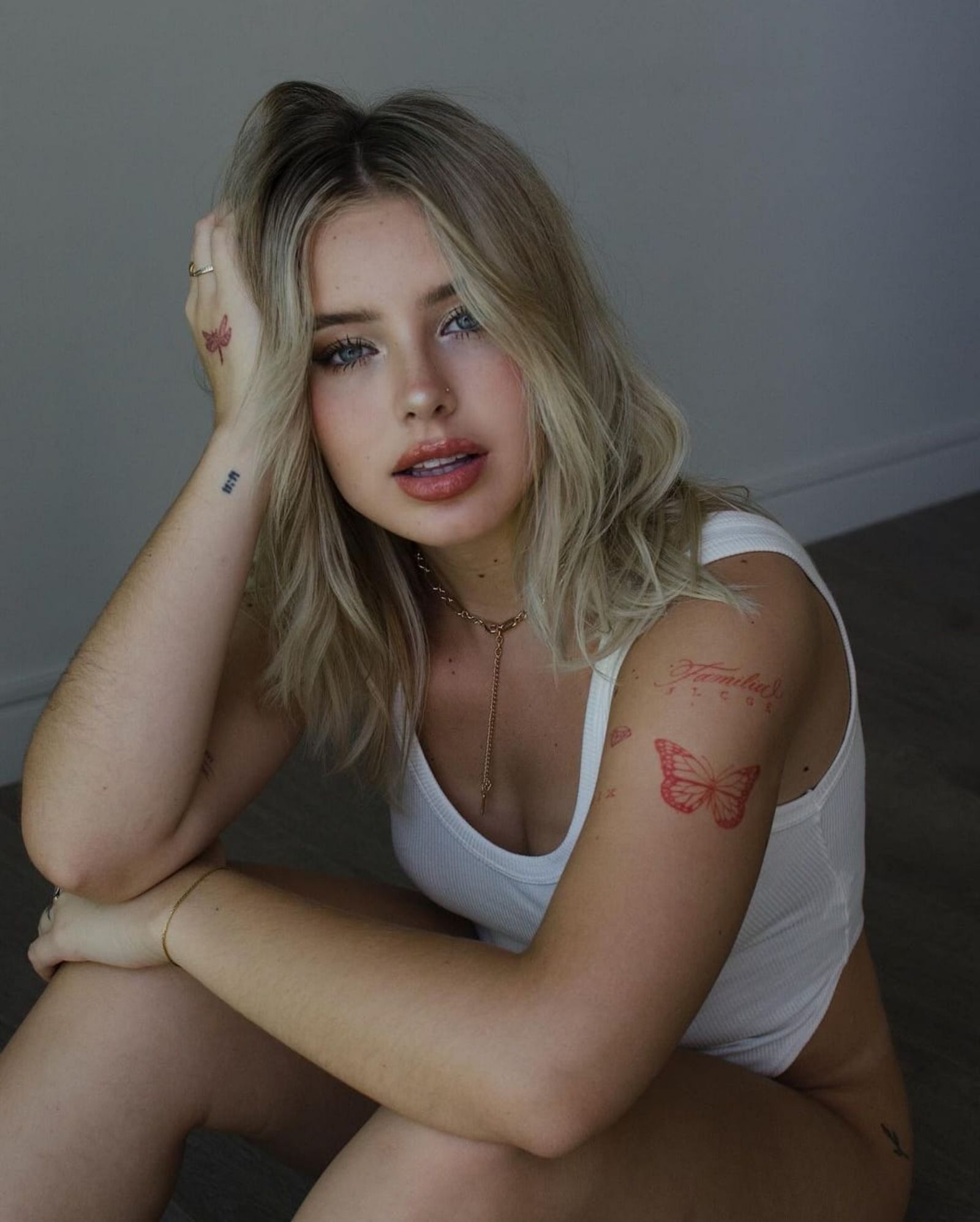 En las imágenes se puede a ver a Coti usando un body blanco de morley y una cadena dorada. La influencer optó por usar el pelo suelto, con ondas, y un maquillaje sutil: gloss, rubor y sombra de ojos.