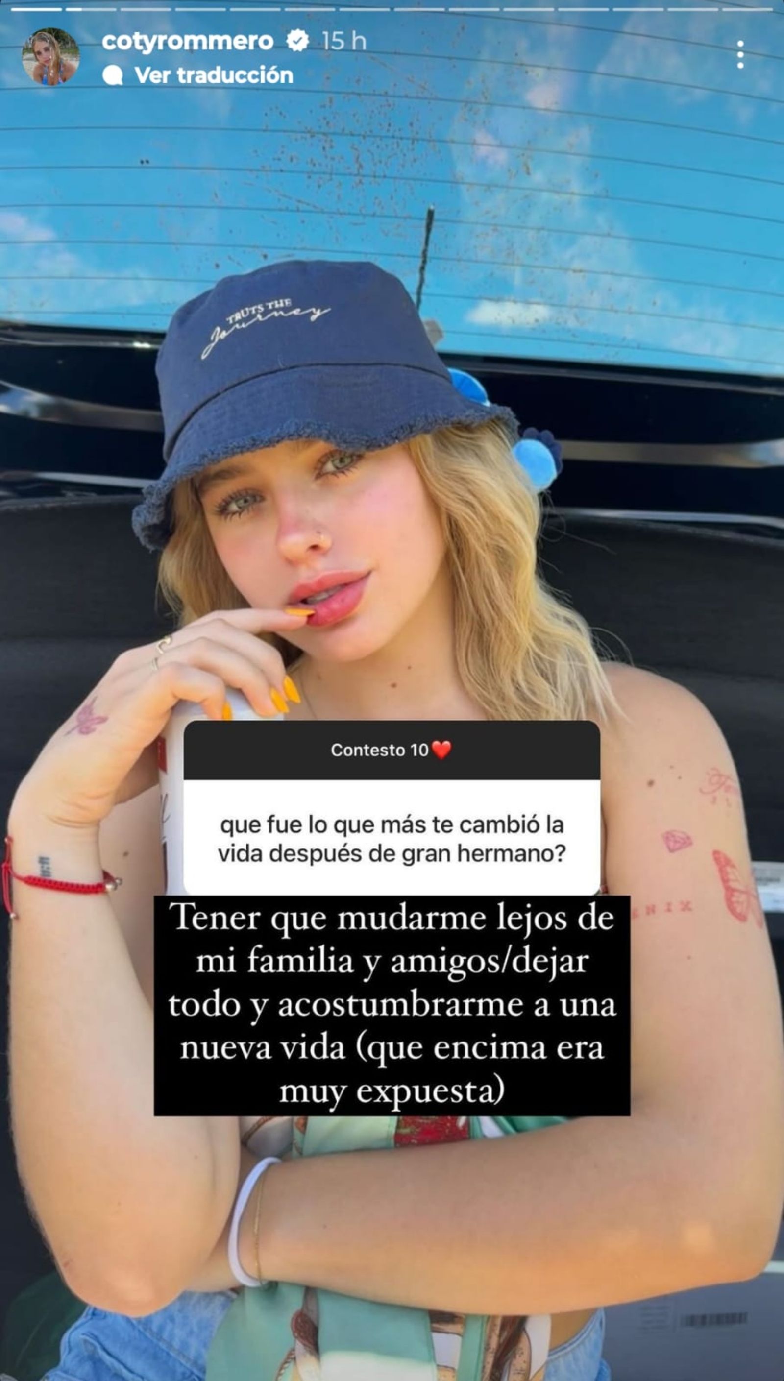 "¿Qué fue lo que más te cambió la vida después de Gran Hermano?" le preguntaron a la influencer. "Tener que mudarme lejos de mi familia y amigos, dejar todo y acostumbrarme a una nueva vida (que encima era muy expuesta)", contestó la exconcursante de Gran Hermano.