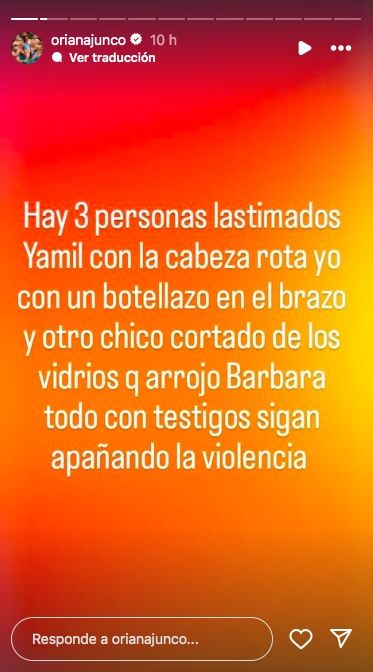Además, lamentó que la policía no se llevara a ningún detenido: "No los agarraron, ellos siguieron cantando, chupando, tomando como si nada. Así que Yamil hizo la denuncia, yo no porque ya me voy del país. Llamamos a la policía para poder retirarnos del lugar, porque había como 25 personas afuera, todos armados, todos drogados", concluyó.