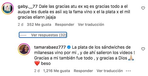 "Dale las gracias a tu ex porque todo es gracias a él, aunque les duela... Es así porque la fama vino por él y también la plata, gracias a Elián", opinó una seguidora, en clara relación a L-Gante. Al ver esto, Tamara respondió: "La plata de los sandwiches de milanesas vino por mí y de ahí salieron los videos, gracias a mí también fue todo y gracias a Dios".
