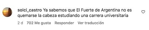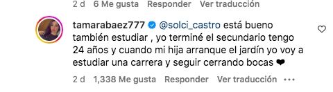 Por su parte, otro usuario comentó: "Ya sabemos que el fuerte de Argentina no es quemarse la cabeza estudiando una carrera universitaria...". Atenta a cada mensaje, la rubia comentó: "Está bueno también estudiar, yo terminé el secundario y tengo 24 años. Cuando mi hija arranque el jardín voy a estudiar una carrera y seguir cerrando bocas".