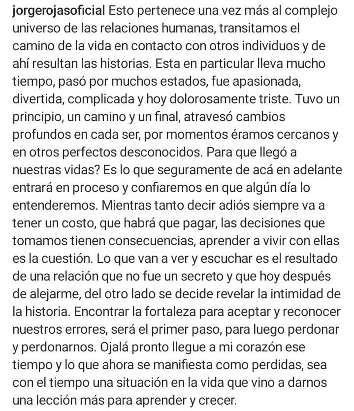 Por su parte, y luego de la revolución que generaron estos posteos, Jorge Rojas publicó un confuso descargo en sus redes sociales. De alguna forma le dio crédito a la versión de Muriel, con quien habría sostenido esta doble vida entre ella y su esposa: “Esta historia en particular lleva mucho tiempo, pasó por muchos estados, fue apasionada, divertida, complicada y hoy dolorosamente triste”, dice, por ejemplo.