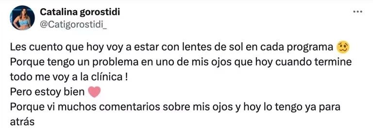 “Les cuento que hoy voy a estar con lentes de sol en cada programa. Tengo un problema en uno de mis ojos que hoy cuando termine todo me voy a la clínica", explicó Catalina a través de un posteo que realizó por estas horas en la red social X.