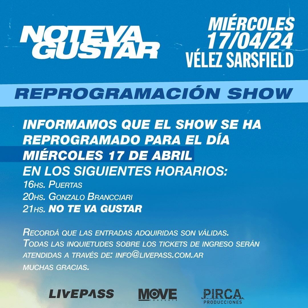 No Te Va Gustar se encuentra celebrando sus 30 años de carrera con una gira que sumará varias provincias de la Argentina. El puntapié inicial sería Buenos Aires en la cancha de Vélez. Pero la fecha inicial, pautada para el 6 de abril, tuvo que reprogramarse por un compromiso futbolístico del equipo de Liniers.