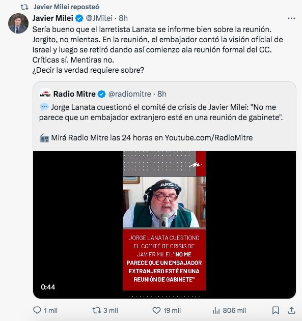 "Sería bueno que el larretista Lanata se informe bien sobre la reunión. Jorgito, no mientas. En la reunión, el embajador contó la visión oficial de Israel y luego se retiró, dando así comienzo a la reunión formal del CC. Críticas sí. Mentiras no. ¿Decir la verdad requiere sobre?", había expresado Milei.