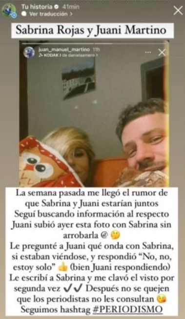 Todo empezó cuando el periodista Gustavo Méndez detectó una foto en las historias de Instagram de Juan Martino que le llamó mucho la atención. En la publicación temporal se veía al actor con una mujer rubia, parcialmente tapada, muy parecida a Sabrina Rojas. Desde ese momento, todo se potenció, Sabrina lo negó y, llegada la noche, se pronunció al aire, en el ciclo que conduce junto a Tartu, Pasó en América.