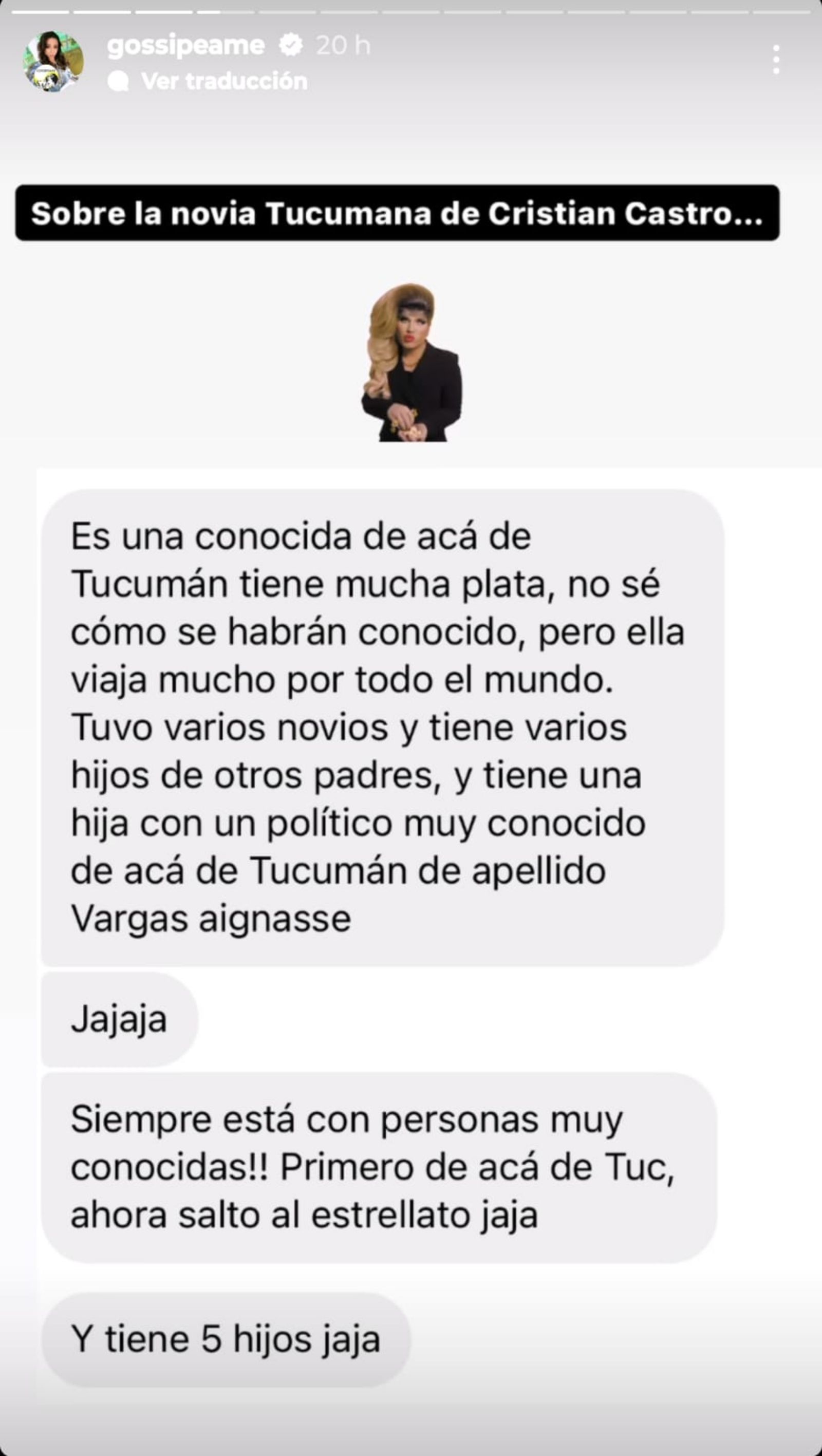 "Ella es de aquí de Tucumán"; "Muy polémica, jaja"; "Es una conocida de acá de Tucumán tiene mucha plata, no sé cómo se habrán conocido, pero ella viaja mucho por todo el mundo. Tuvo varios novios y tiene varios hijos de otros padres, y tiene una hija con un político muy conocido de acá de Tucumán de apellido Vargas Aignasse. ¡¡¡Siempre está con personas muy conocidas!!! Primero de acá de Tucumán, ahora salto al estrellato, jaja. Y tiene 5 hijos", fueron algunos de los comentarios que le llegaron a Marcia sobre la nueva pareja de Cristian Castro.