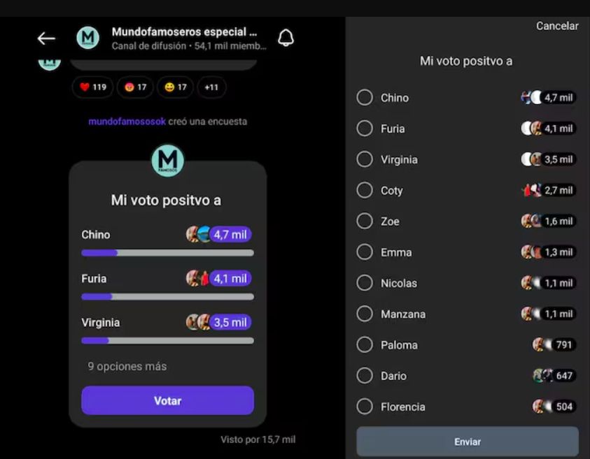Así, tanto en encuestas de Instagram y X, se fueron revelando datos contundentes. La cuenta Mundo Famosos arrojó que el participante que ocupa el primer lugar de favoritismo del público es el Chino, con 4.700 votos y le sigue Furia, con 4.100. El podio lo completa Virgina, con 3.500. Por su parte, Florencia y Darío se disputan los últimos lugares, lo que los coloca como los que más chances tienen de quedar afuera.