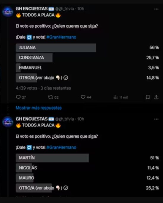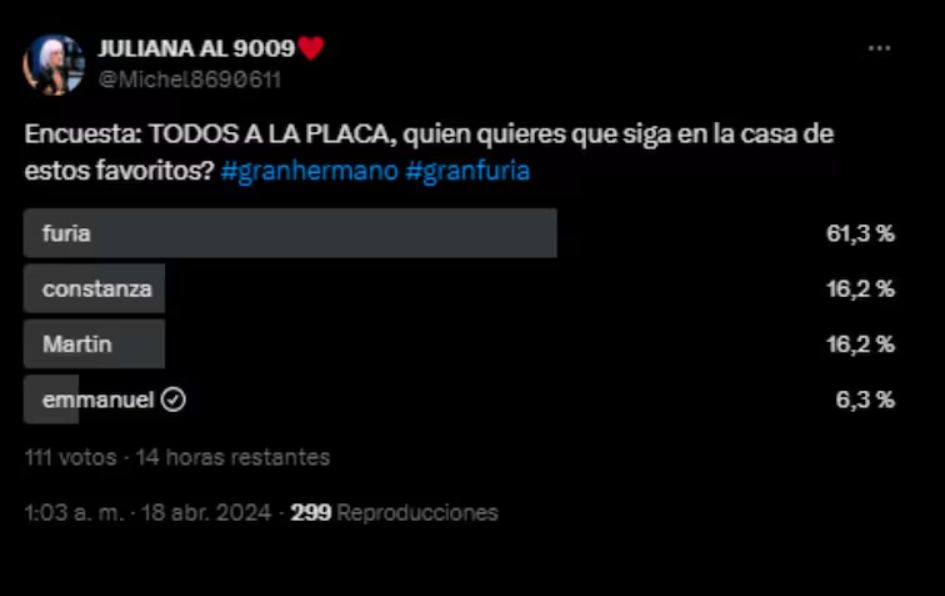 Finalmente, la cuenta de X @michael8690611 repitió los resultados de la encuesta anterior, lo que indicaría que el público se inclina a que Juliana continúe en la casa.