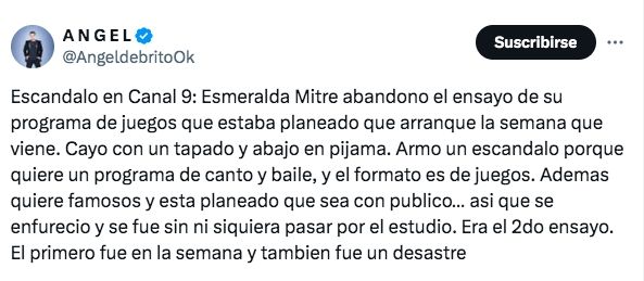 Fue Ángel de Brito quien catalogó de "un desastre" los ensayos del nuevo ciclo. "Escándalo en Canal 9. Esmeralda Mitre abandonó el ensayo de su programa de juegos, que estaba planeado que arrancara la semana que viene", comenzó expresando el conductor de LAM (América TV).