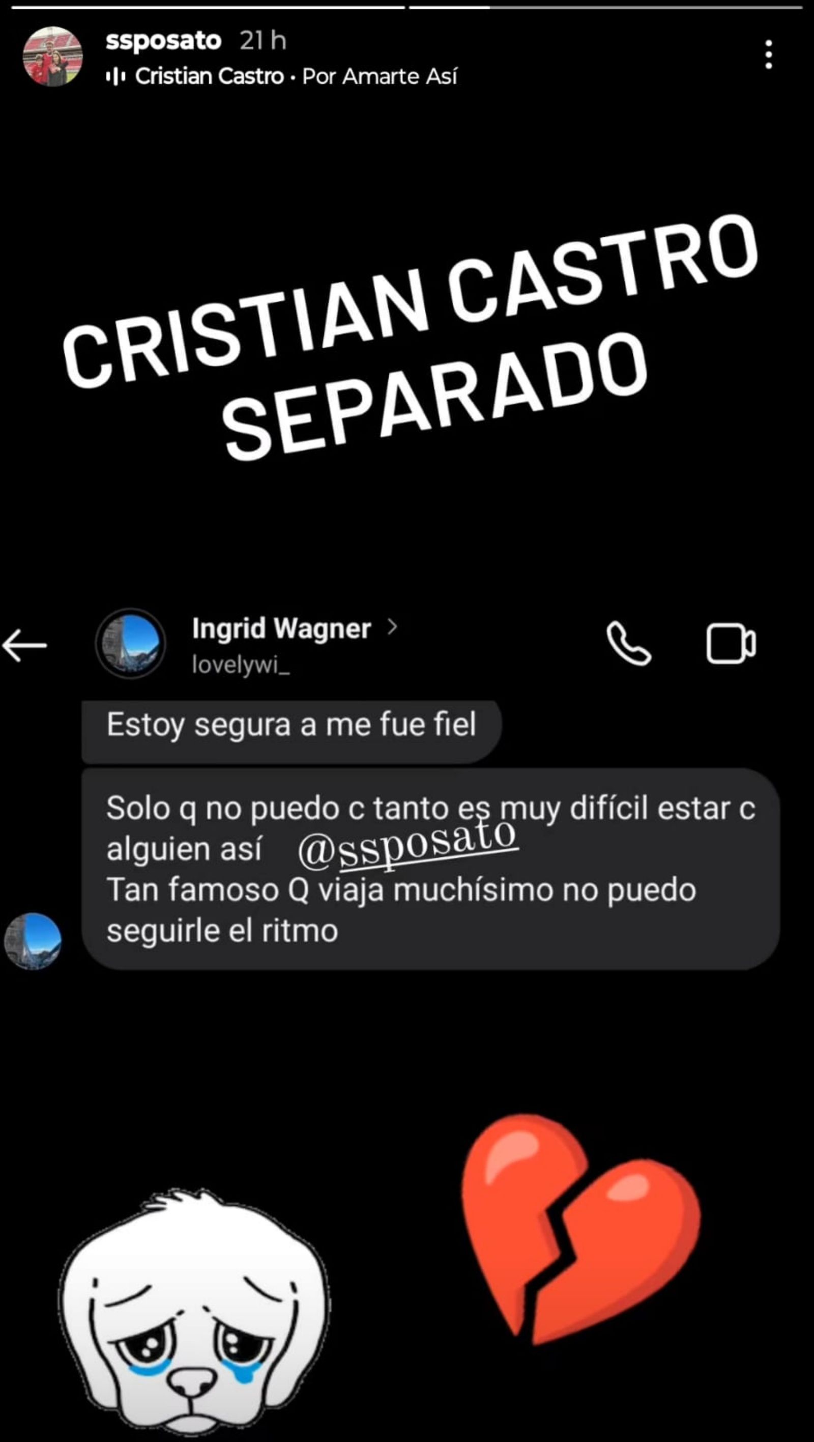 Sin embargo, su amor duró poco tiempo y, en las últimas horas, Ingrid confesó que se separó del músico. Fue Santiago Sposato, movilero de Los Ángeles de la Mañana (LAM) (@Ssposato), quien compartió los chats con la mujer, donde revela su ruptura con el cantante y los motivos.
