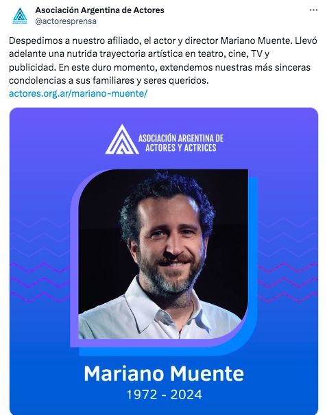 "Despedimos a nuestro afiliado, el actor y director Mariano Muente. Llevó adelante una nutrida trayectoria artística en teatro, cine, TV y publicidad. En este duro momento, extendemos nuestras más sinceras condolencias a sus familiares y seres queridos", expresaron.
