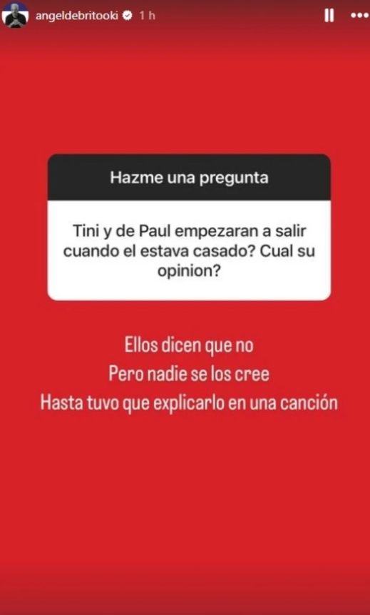 Así lo hizo expreso Ángel de Brito en sus historias de Instagram, al responder, cortito y al pie, una de las consultas de sus millones de seguidores. “¿Tini y De Paul empezaron a salir cuando él estaba casado? ¿Cuál es su opinión?”, le preguntaron al conductor de América. Y él contestó: "Ellos dicen que no, pero nadie se los cree. Hasta tuvo que explicarlo en una canción”.