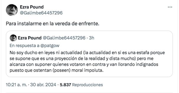 "No soy ducho en leyes ni actualidad (la actualidad en si es una estafa porque se supone que es una proyección de la realidad y dista mucho) pero me alcanza con suponer quienes votaron en contra y van llorando indignados puesto que ostentan (poseen) moral impoluta", expresó el cantante en su cuenta de X (ex Twitter).