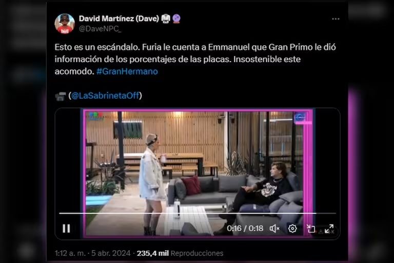 El video donde se muestra que Furia recibe data de la producción de Gran Hermano