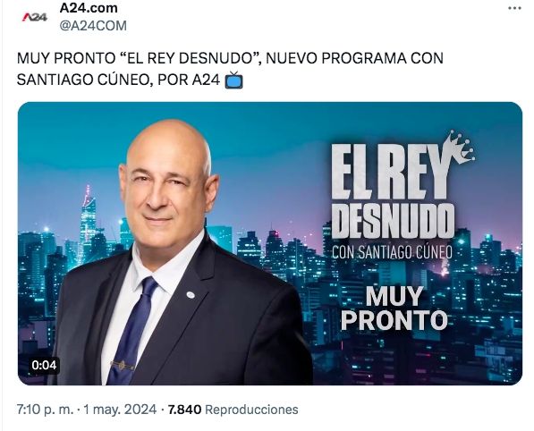 A24 informó que un polémico periodista se sumará a la grilla de programas de la señal. A través de las redes sociales oficiales del canal, se anunció que "muy pronto, El Rey Desnudo, nuevo programa con Santiago Cúneo, por A24". Según trascendió, el verborrágico conductor saldrá al aire de lunes a jueves de 22 a 23 hs y viernes de 22 a 00 hs.