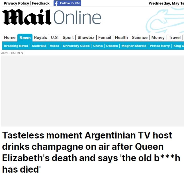 "Momento de mal gusto en el que un presentador de televisión argentino bebe champán en directo tras la muerte de la reina Isabel y dice 'la vieja put* ha muerto'", tituló el medio británico.