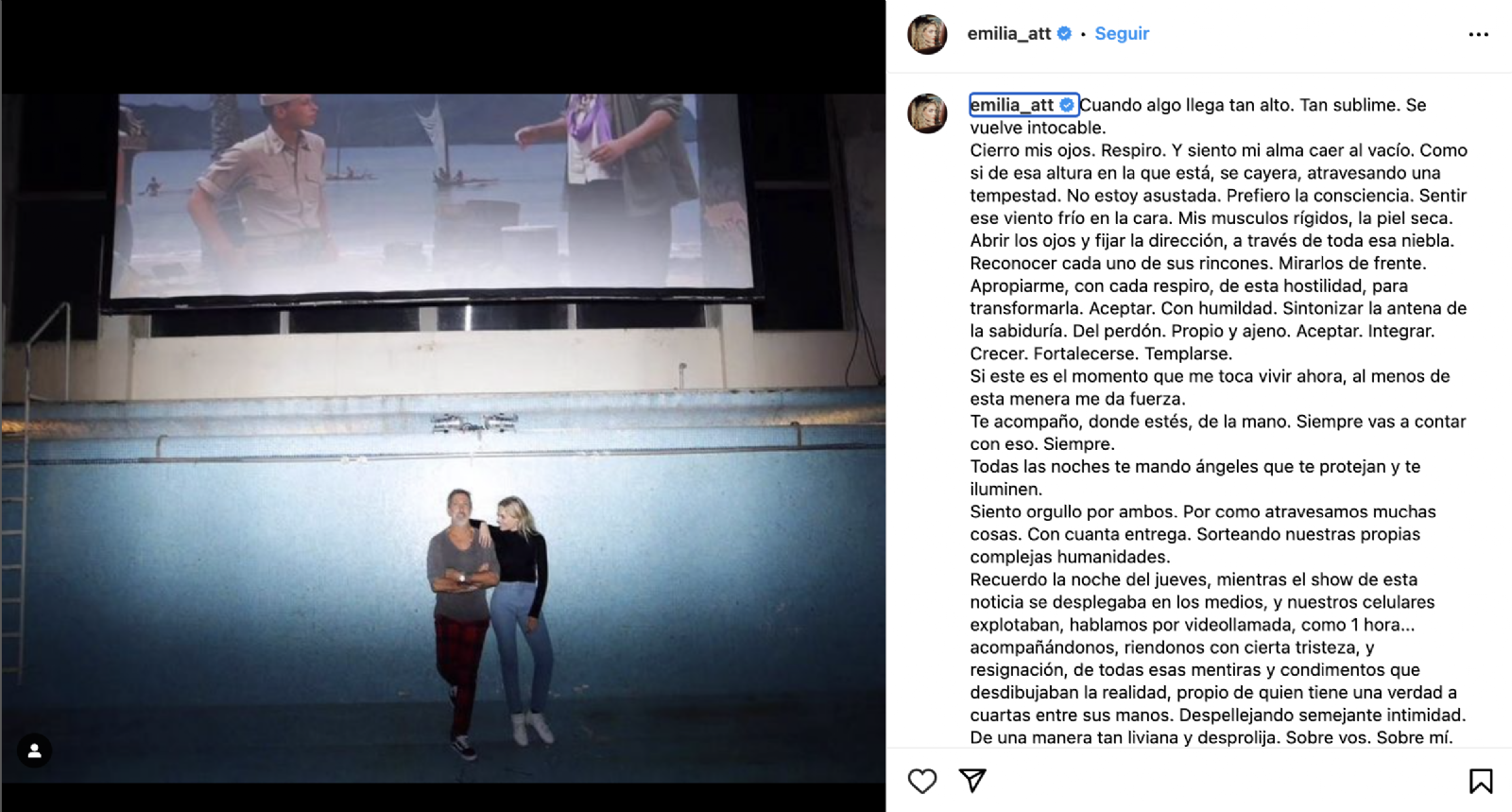 “Recuerdo la noche del jueves, mientras el show de esta noticia se desplegaba en los medios, y nuestros celulares explotaban, hablamos por videollamada, como una hora... acompañándonos, riéndonos con cierta tristeza, y resignación, de todas esas mentiras y condimentos que desdibujaban la realidad, propio de quien tiene una verdad a cuartas entre sus manos. Despellejando semejante intimidad. De una manera tan liviana y desprolija. Sobre vos. Sobre mí”, expresó.