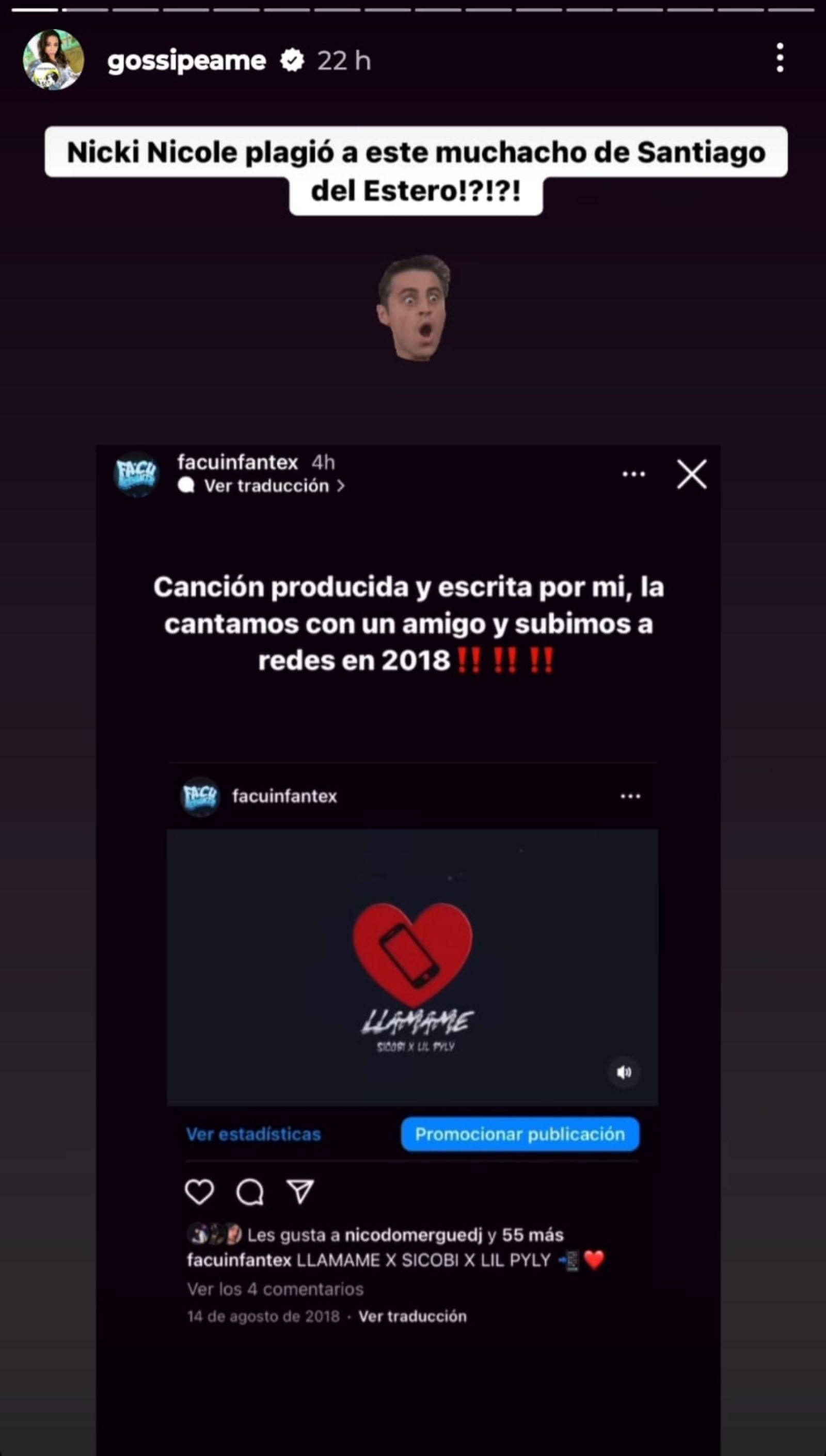 A menos de una semana de haber publicado el audiovisual, un artista oriundo de Santiago del Estero acusó a Nicki de haberle robado su tema musical. Facu Infantex, productor y DJ santiagueaño, mostró la evidencia de plagio en su cuenta de Instagram (@Facuinfantex) y se mostró muy indignado por la situación.