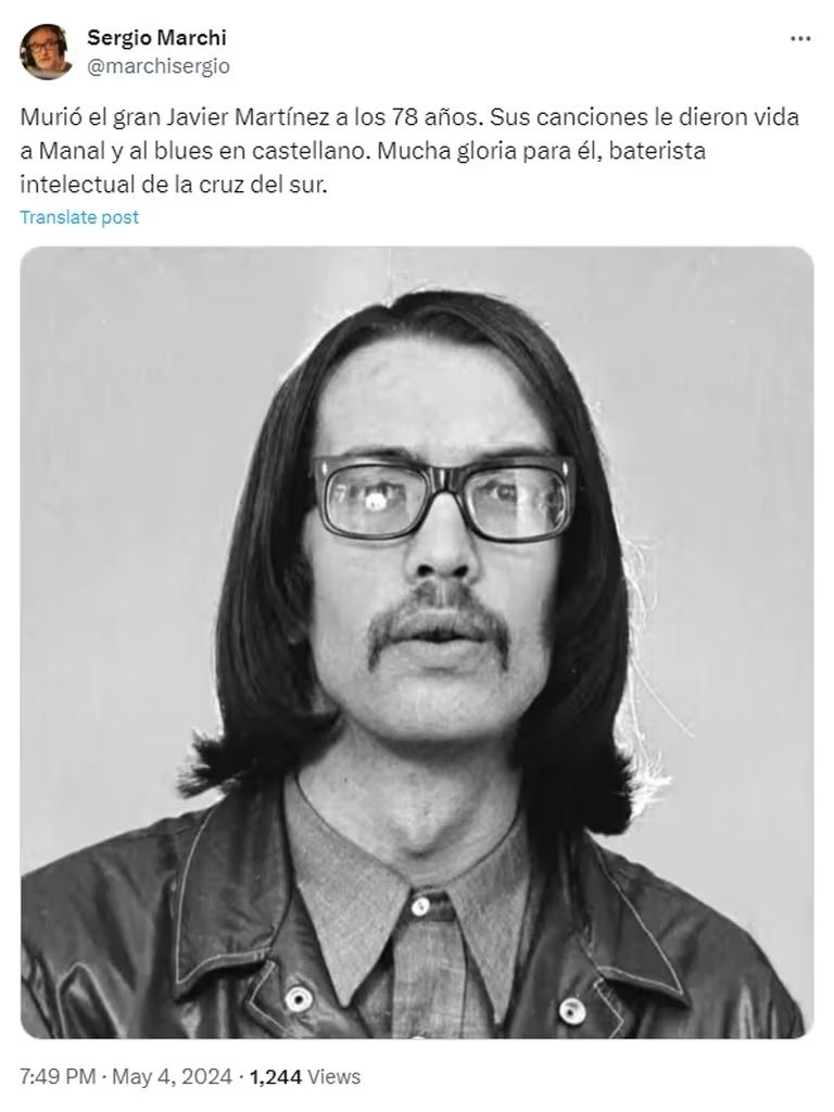 “Murió el gran Javier Martínez a los 78 años. Sus canciones le dieron vida a Manal y al blues en castellano. Mucha gloria para él, baterista intelectual de la cruz del sur”, escribió el mencionado especialista en rock nacional.