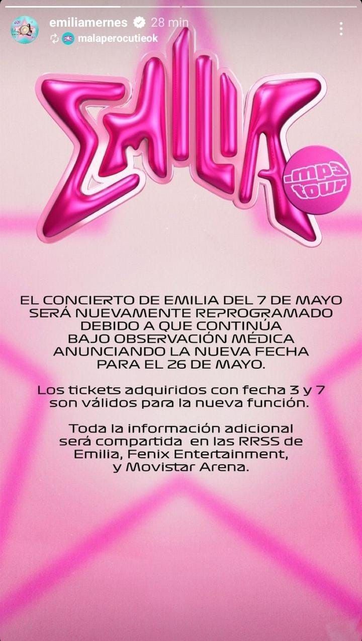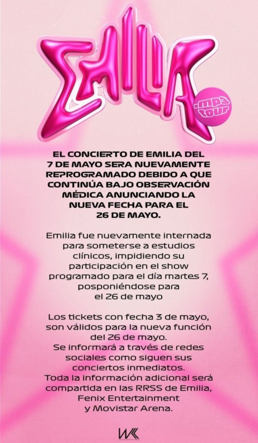 "Emilia fue nuevamente internada para someterse a estudios clínicos, impidiendo su participación en el show programado para el día martes 7, posponiéndose para el 26 de mayo", comenzaron expresando en un posteo que compartieron en sus redes sociales oficiales de la artista. "Los tickets adquiridos con fecha 3 y 7 de mayo son válidos para la nueva función", agregaron.