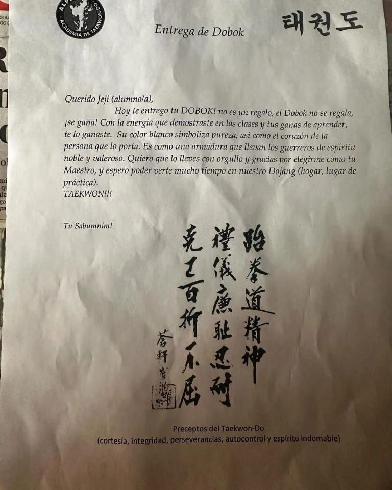 Su color blanco simboliza pureza, así como el corazón de la persona que lo porta. Es como una armadura que llevan los guerreros de espíritu noble y valeroso. Quiero que lo lleves con orgullo y gracias por elegirme como tu Maestro y espero poder verte mucho tiempo en nuestro Dojang”, cerró.