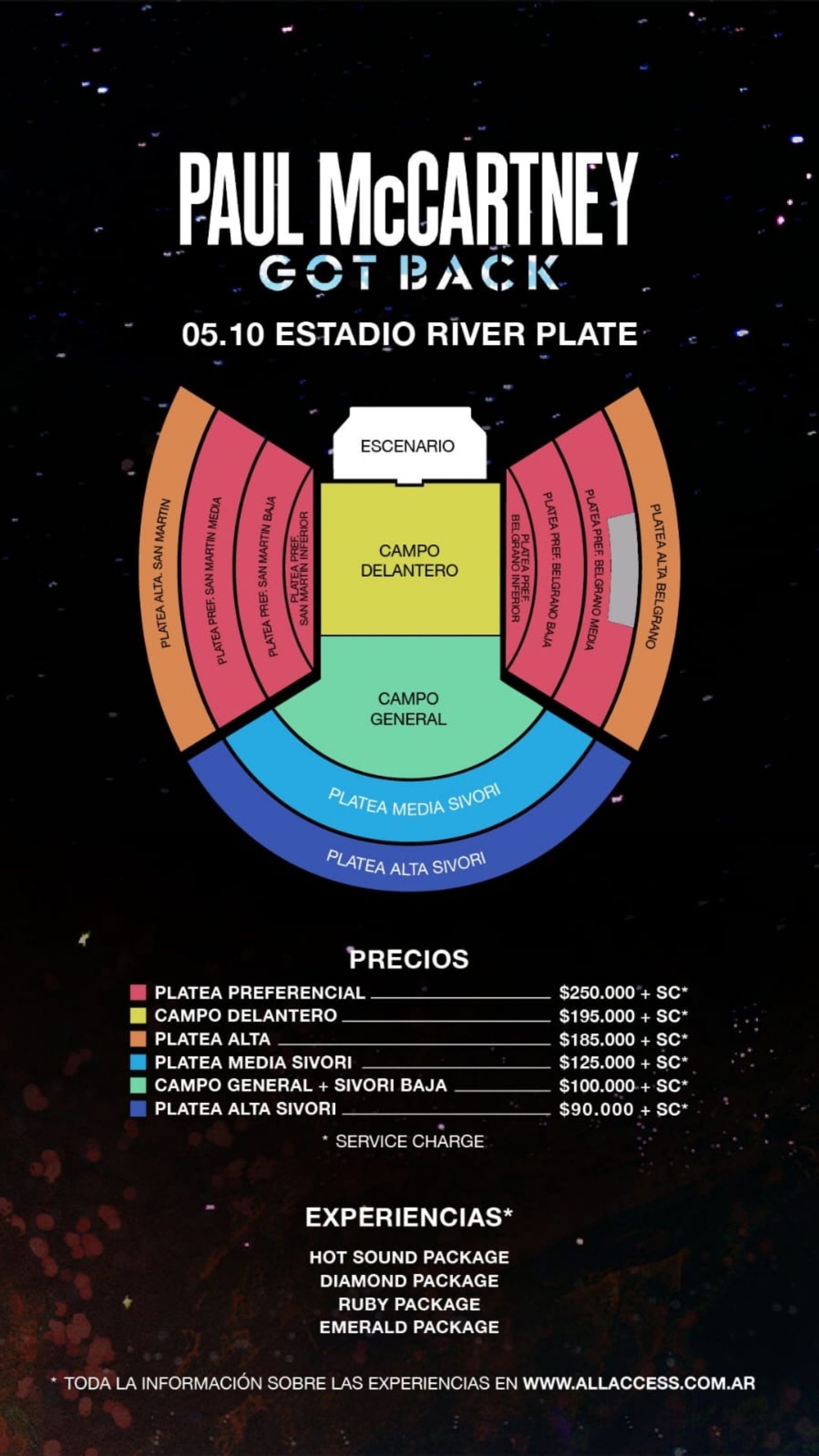 - Platea Baja Preferencial: $245.000 + recargo.