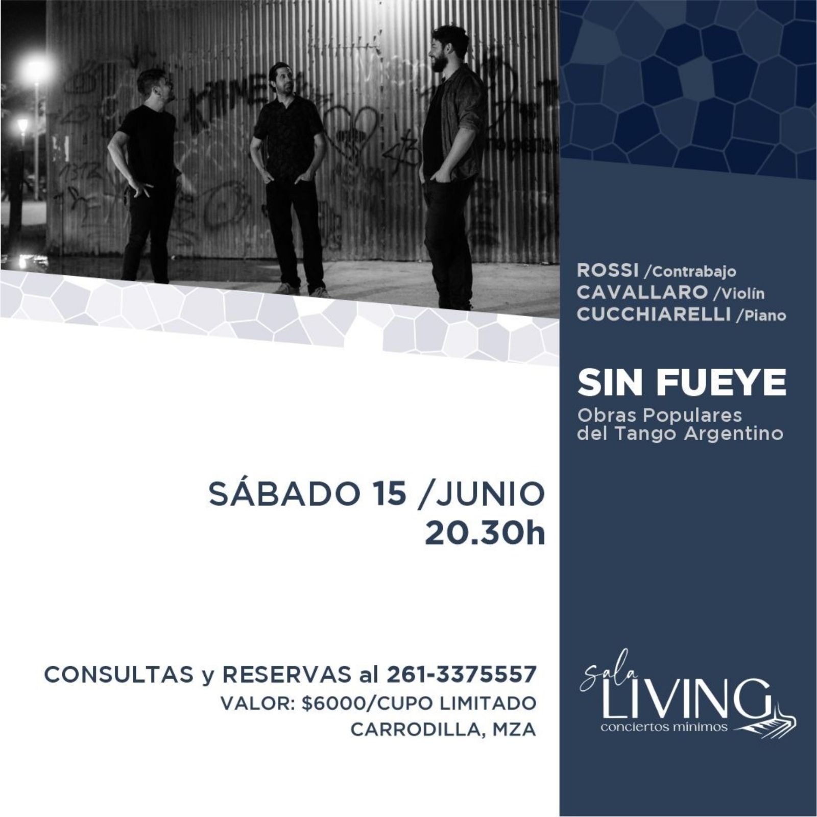 Este próximo sábado 15 de junio, Salaliving recibirá al trío Sin Fueye, que presentará Obras Populares del Tango Argentino. Integrada por Enzo Rossi (Contrabajo), Bruno Cavallaro (Violín) y Juan Emilio Cucchiarelli (Piano), la agrupación realizará un concierto que fusiona la rica tradición del tango con elementos modernos y experimentales.