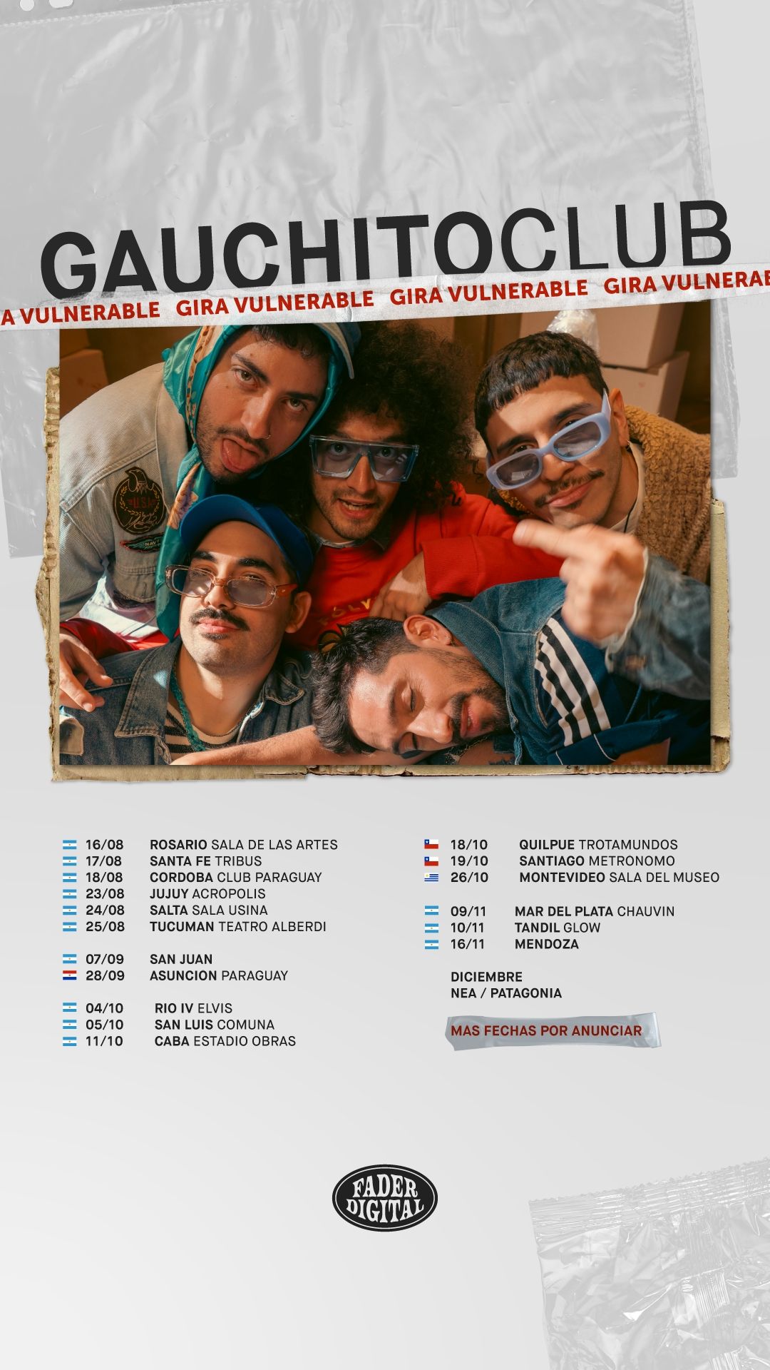 Luego de su reciente y exitosa gira por España, con fechas agotadas en Barcelona, Madrid, Málaga y Valencia, este viernes 14 de junio Gauchito Club lanzó Vulnerable, su tercer disco de estudio, y anuncia gira nacional de presentación que los llevará a recorrer gran parte del país y varios países de Latinoamérica.