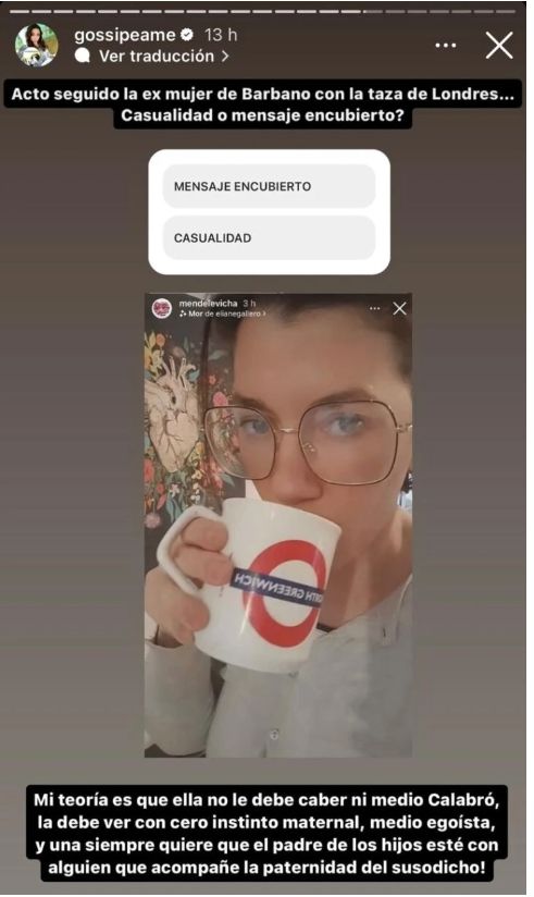 A esa información que emergió a la luz de la mano de Tauro se produjo un movimiento muy peculiar de la ex esposa de Barbano. Resulta que Micaela Mendelevich utilizó su perfil oficial de Instagram para colgar una storie con una foto, que algunos interpretaron como una ironía para Marina.