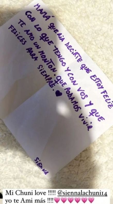 “Mamá, quería decirte que estoy feliz con lo que tengo y con vos. Y que te amo un montón. Que podamos vivir felices para siempre”, le escribió la niña. “Mi Chuni love. Sienna, yo te amo más”, le respondió Nicole, al publicar la tierna cartita.