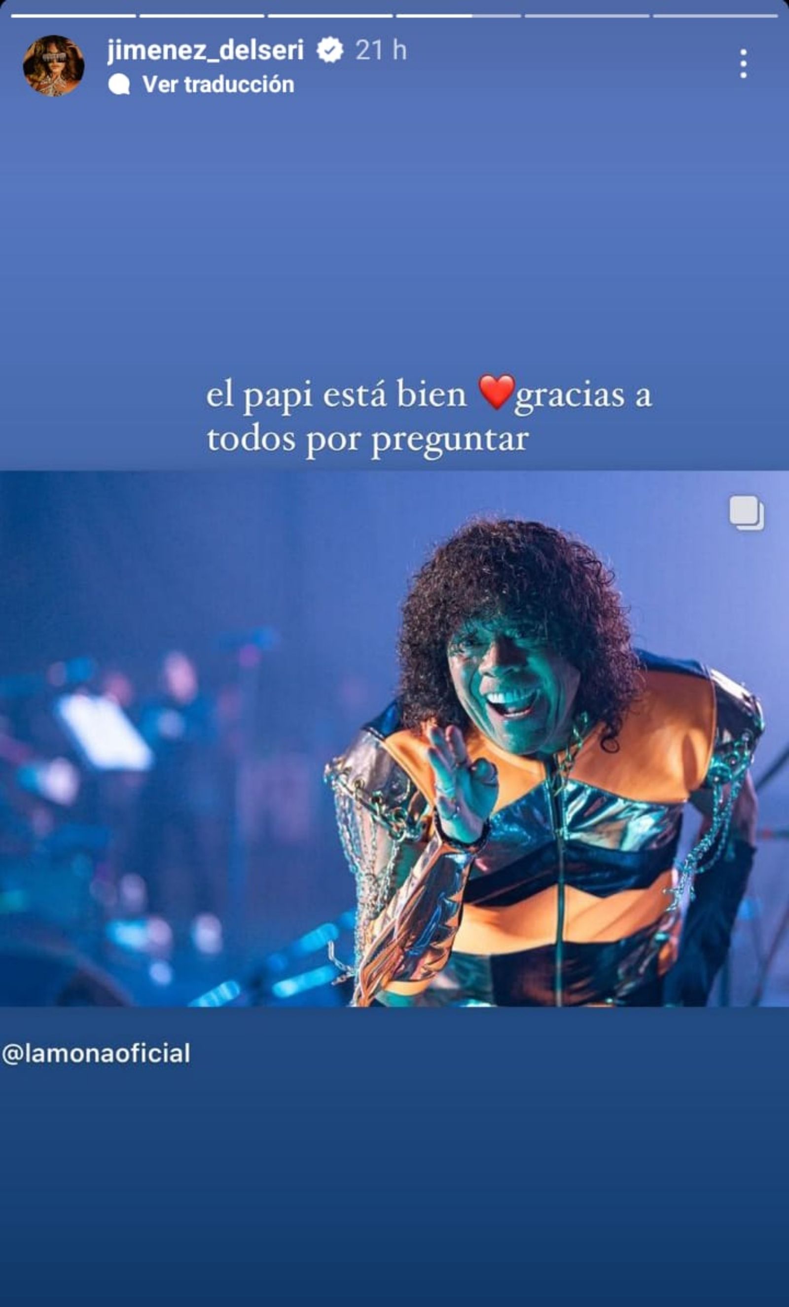 Asimismo, su hija Natalia llevó tranquilidad. La mujer compartió un mensaje en sus historias de Instagram (@Jimenez_delseri) contando que su padre se encuentra mejor. "El papi está bien. Gracias a todos por preguntar", escribió junto a una imagen del músico.