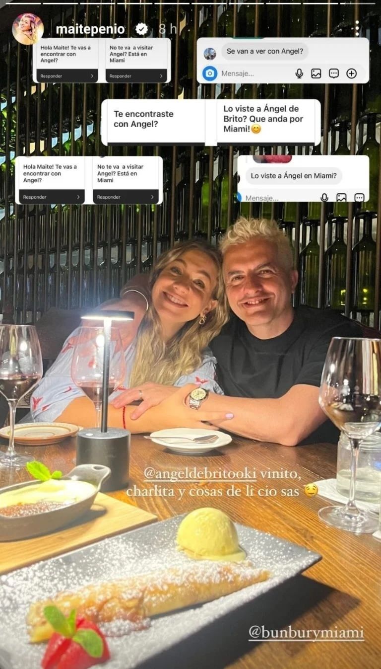 La periodista subió una bella fotografía junto a Ángel de Brito, ambos muy sonrientes y confirmando que finalmente pudieron reunirse para disfrutar de un íntimo momento. “Vinito, charlita y cosas deliciosas”, expresó en sus historias de Instagram.
