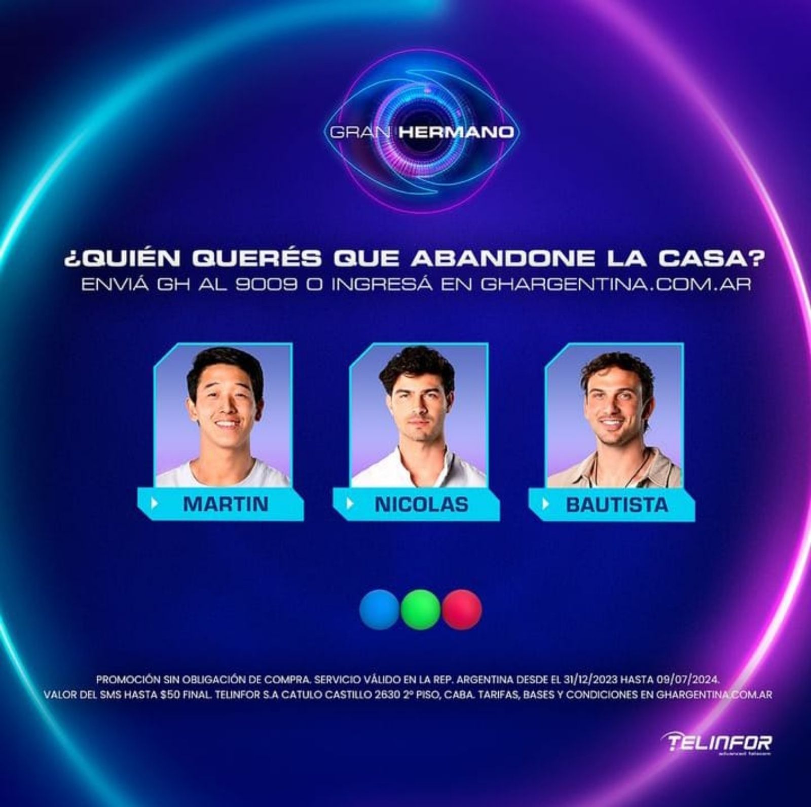 Una de las galas de eliminaciones más importantes de Gran Hermano 2023 se llevó a cabo este domingo. Y es que, luego de la decisión de Emmanuel VIch de salvar a Darío Martínez Corti y subir a Bautista Mascia a la placa de esta semana, quienes quedaron nominados para la Gala de Eliminación de este domingo son: Martín Ku; Nicolás Grosman; y Mascia, quienes forman parte del team "Los Bros".