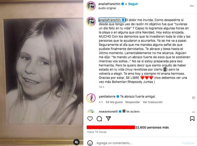"Hoy estoy enojada. Mucho. Con los demonios que te invadieron toda la vida y las personas que te ayudaron a acunarlos. Ya se me va a pasar. Seguramente el día que me mandes alguna señal de que pudiste finalmente derrotarlos. Te abracé y besé hasta el último momento. Te quiero decir que siento orgullo de haber estado en tu vida pero te volvería a elegir. Te amo, hoy y siempre, mi enana hermosa. Gracias por estar. se libre", concluyó.