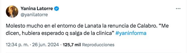 "Molestó mucho en el entorno de Lanata la renuncia de Calabró. Me dicen, 'hubiera esperado que salga de la clínica'", aseguró Latorre desde su cuenta de X, a pesar de que en marzo Calabró ya había considerado la posibilidad de abandonar el ciclo radial.